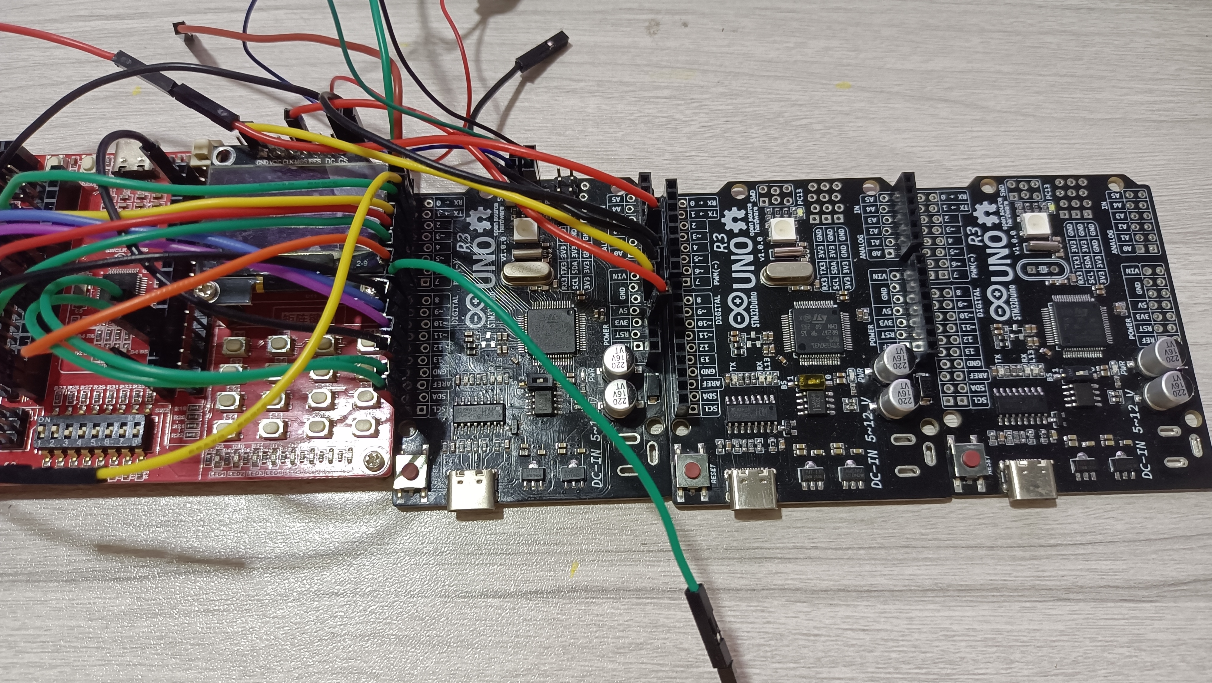 由于手上没有合适的 Arduino UNO R3 系列接口的拓展板,本次功能验证使用一个电赛的底板进行拓展实验。期待后续的活动能有机会制作出相匹配的拓展板。
