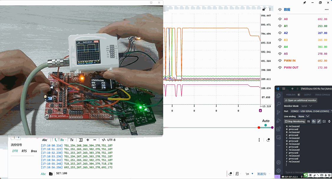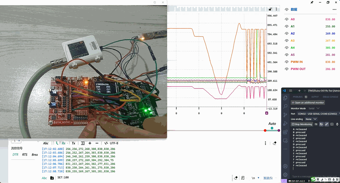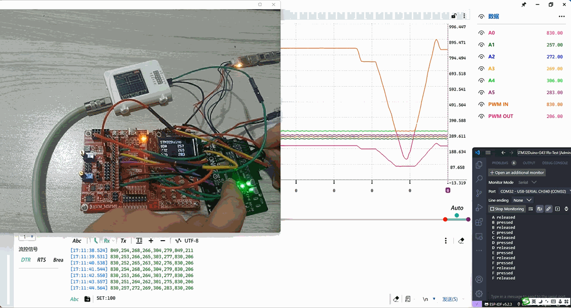 板载6通道ADC输入引脚,由于扩展底板上只有一路ADC输出,因此采用轮流插拔的形式展示6个ADC引脚的采集情况。采集的数据通过串口发送至上位机进行可视化展示,同时在扩展底板的OLED展示上实时显示。