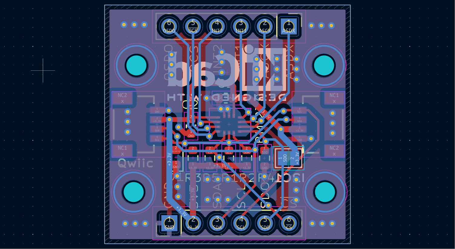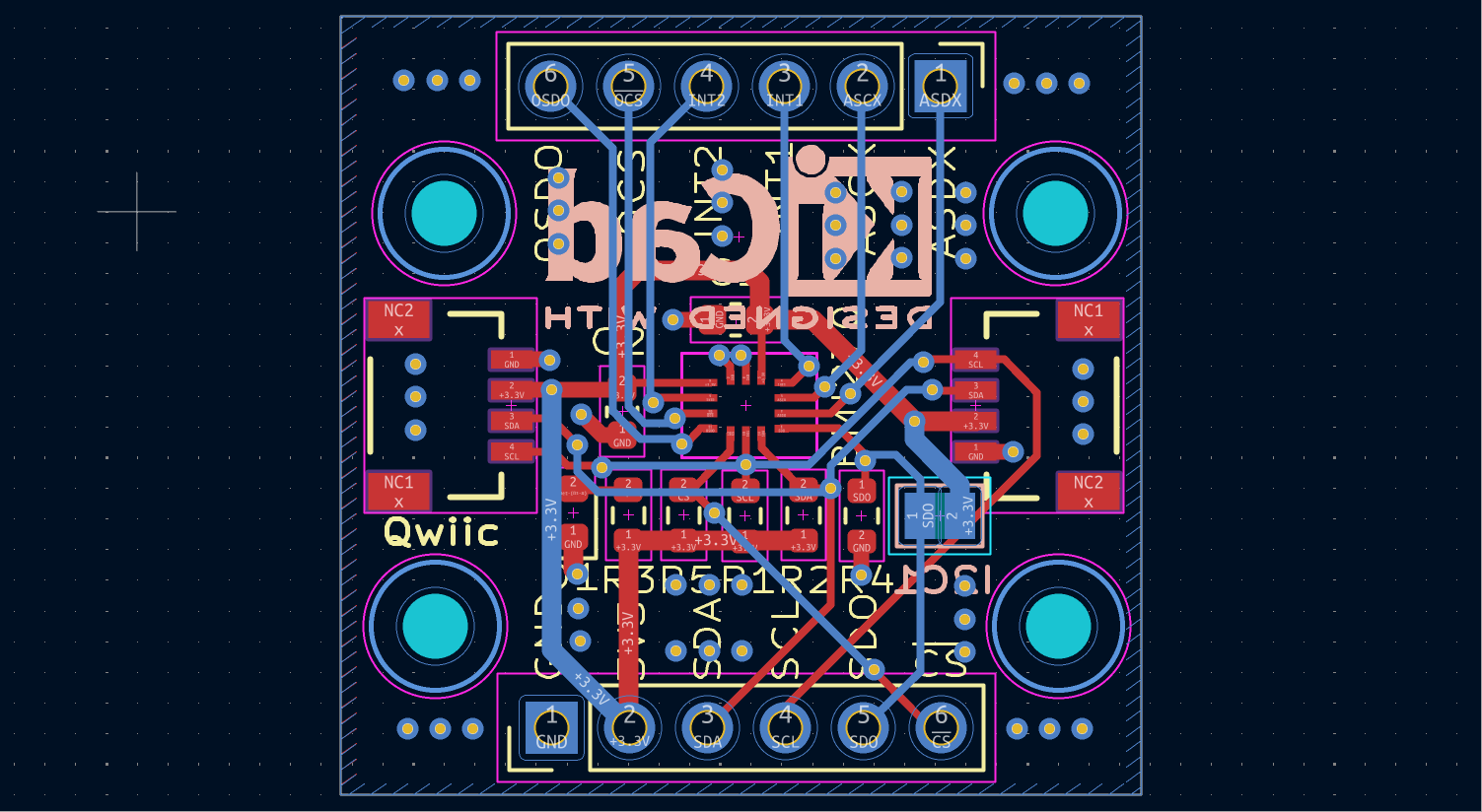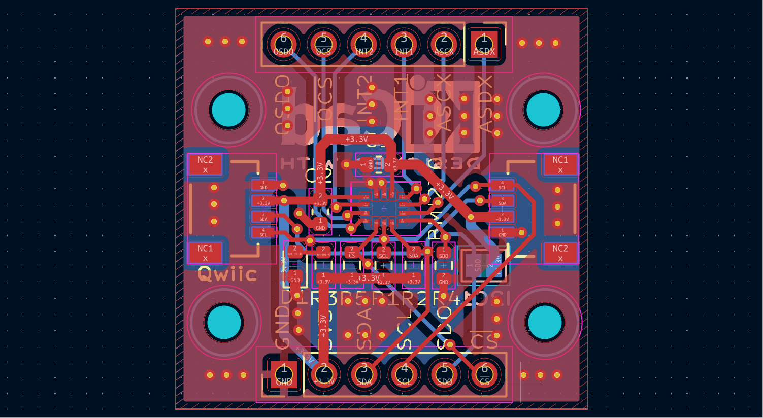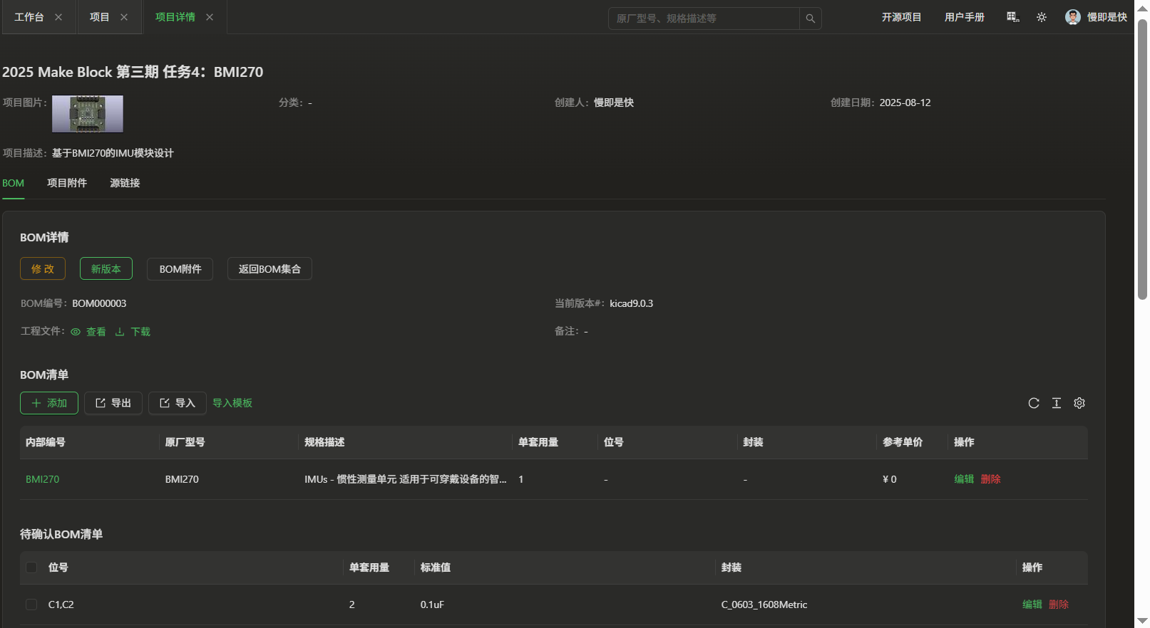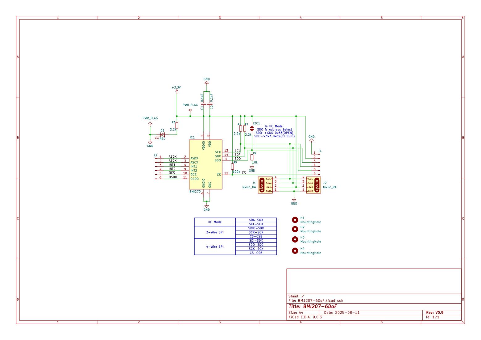基于设计需求,IMU芯片选用BMI270(SMD-10P封装),工作电压范围1.8V-3.3V,该模块集成12个功能引脚:I2C接口(最大400KHz);3.3V与GND电源输入;10MHz从SPI接口(支持3线、4线)。2个用于中断与同步事件独立可编程输入输出引脚。针对可穿戴设备进行了优化,该模块提供16位的三轴加速度、16位的三轴陀螺仪测量和智能片上运动触发中断功能。