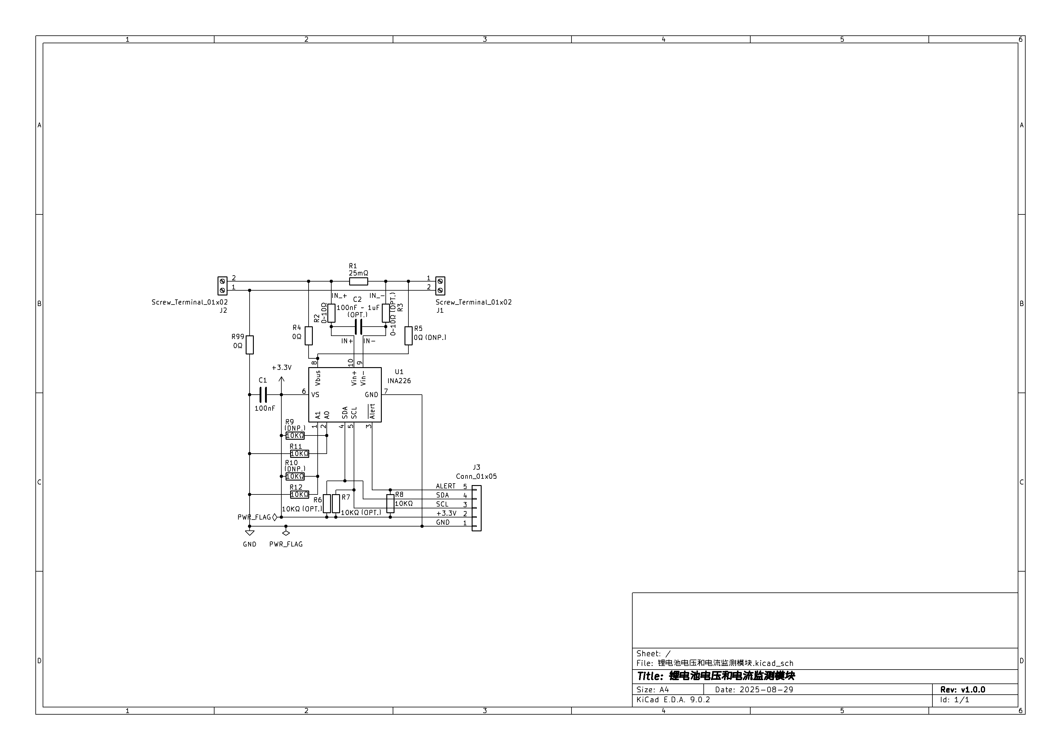 - 电流采样部分:这是设计的核心。在电池的负端(低侧)串联一个精密采样电阻(Shunt Resistor)。根据待测电流大小(如:±3A)和INA226的最佳输入压差(典型为±81.92mV),通过公式 Rshunt = Vshunt_max / I_max 计算并选择合适的阻值(如25mΩ)和功率(如1W)的采样电阻。