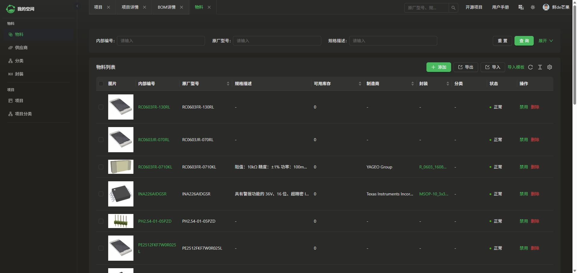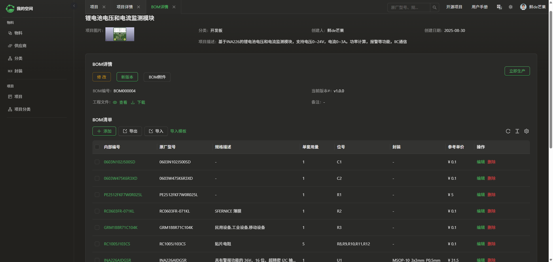 使用了 eZ-PLM 系统上传了自己的工程文件,方便保存记录各个版本,也可随时查阅,系统里查阅不到的物料也支持手动添加。