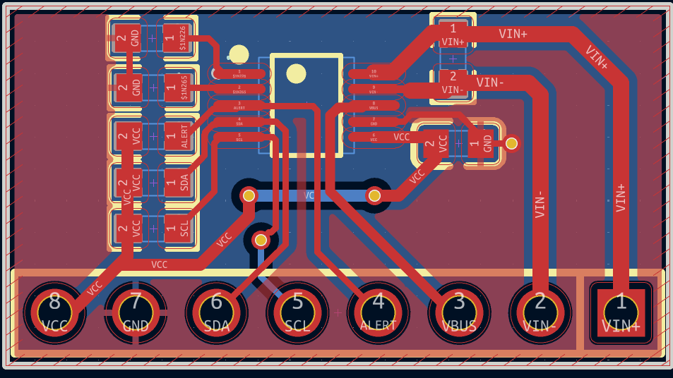 - 采样路径(差分连接):采用差分连接方式,将INA226的VIN+和VIN-的走线直接连接到采样电阻的两端,避免大电流走线产生的压降引入测量误差。