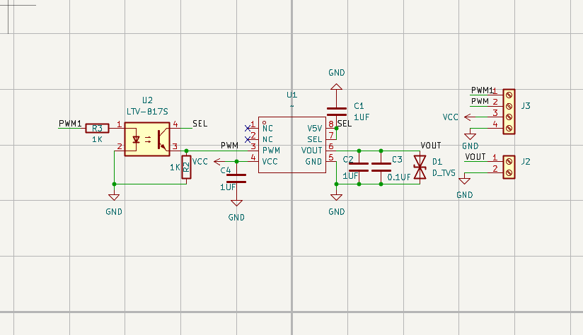 - 输入级:J3端子接入PWM信号,经1K限流电阻(R2,R3)驱动LTV-817S光耦实现2500Vrms电气隔离