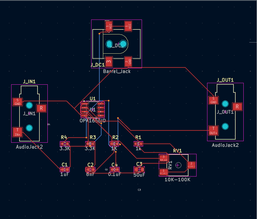 在本次项目中,本人使用 KiCad 完成了音频运放电路的原理图和 PCB 设计。通过实践,掌握了元件选择、封装分配、PCB 布局以及电气规则检查的方法。设计过程中,我学会了使用 Digi-Key 在售元件,绘制板框,处理悬空走线和丝印重叠等问题,确保 PCB 规范可制造。
