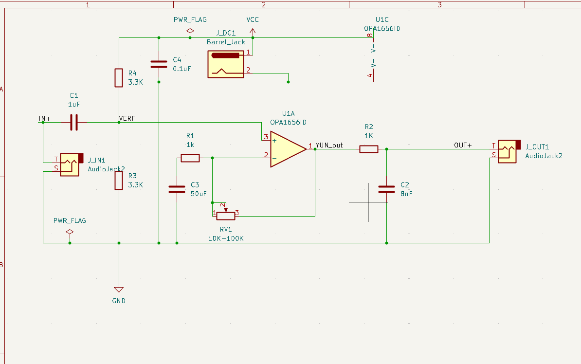 由于本次项目仅需一个运算放大器,故仅使用了OPA1656ID的A运算放大器部分的引脚,他们分别是: