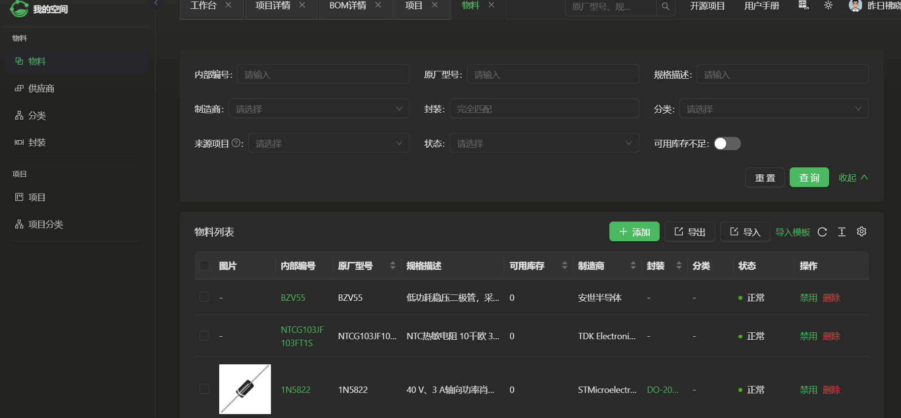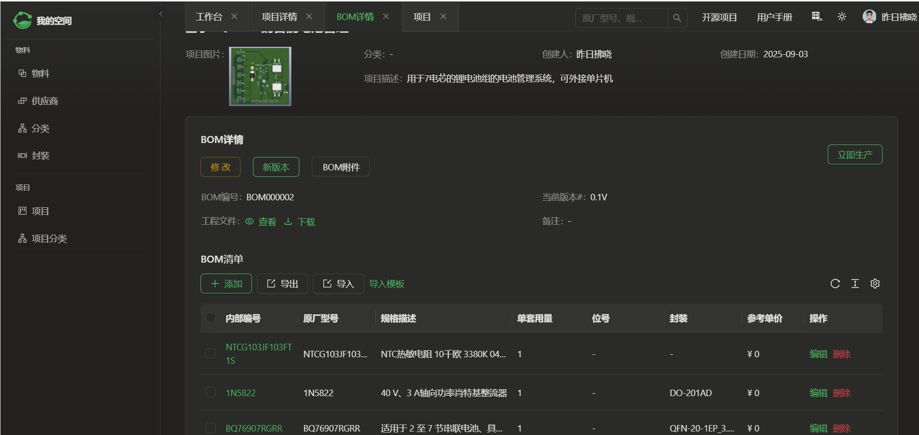 使用了eZ-PLM系统上传了自己的工程文件,方便保存记录各个版本进行版本控制,也可随时查阅,系统里查阅不到的物料也支持手动添加。