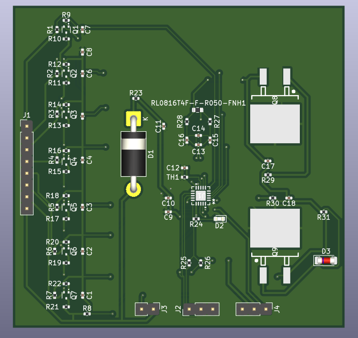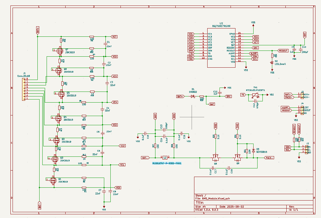 这次任务我选择的电池管理芯片为BQ76907,基于BQ76907这一款高度集成的适用于 2 节至 7 节串联高-精度电池监测器和保护器,该模块提供了一个最大为7电芯的输入接口,通过查表短路的方法可以自由地改变串联的锂电池个数及其电压,同时考虑到电流较大选用外部均衡电路的设计,同时具备电流大小检测、温度报警、过压过流报警等功能,具有IIC接口供单片机连接进行控制。