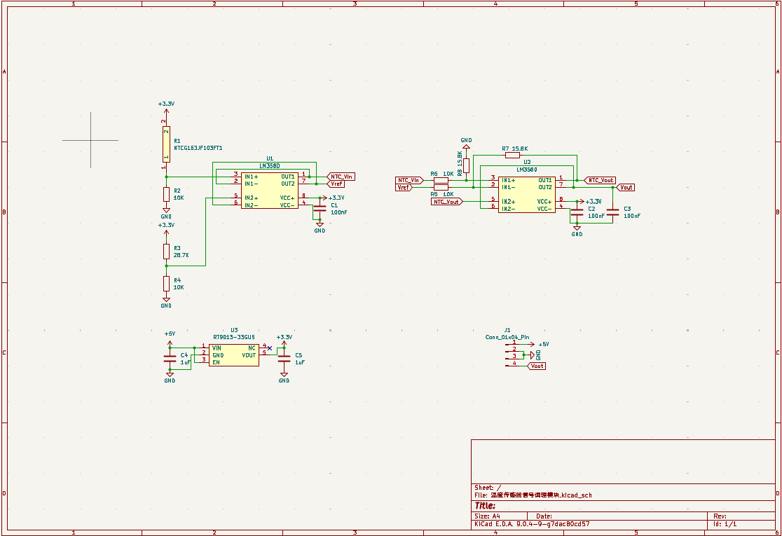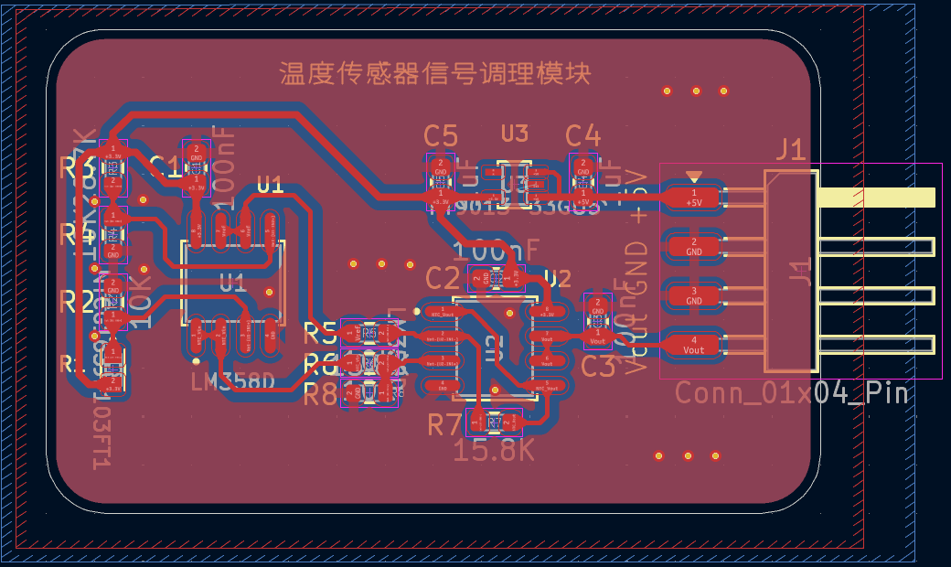 我根据任务,基于LM358D芯片和10K NTC设计了一款热敏电阻温度传感器信号调理 PCB 模块