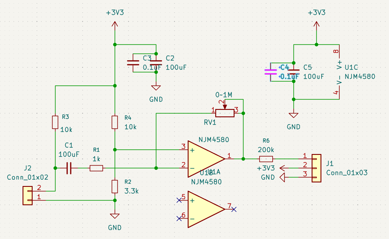 此模块主要用于目标通频带内的低噪音频信号的放大,通过调节电位器,可更改放大倍数。根据任务要求,本次我选用的是NJM4580E。这是一款日本生产的高性能双运算放大器,具有极低的总谐波失真加噪声和宽广的带宽,输入电压噪声密度低,且具备较高的转换速率和大输出驱动能力,是较为理想的音频放大器模块。