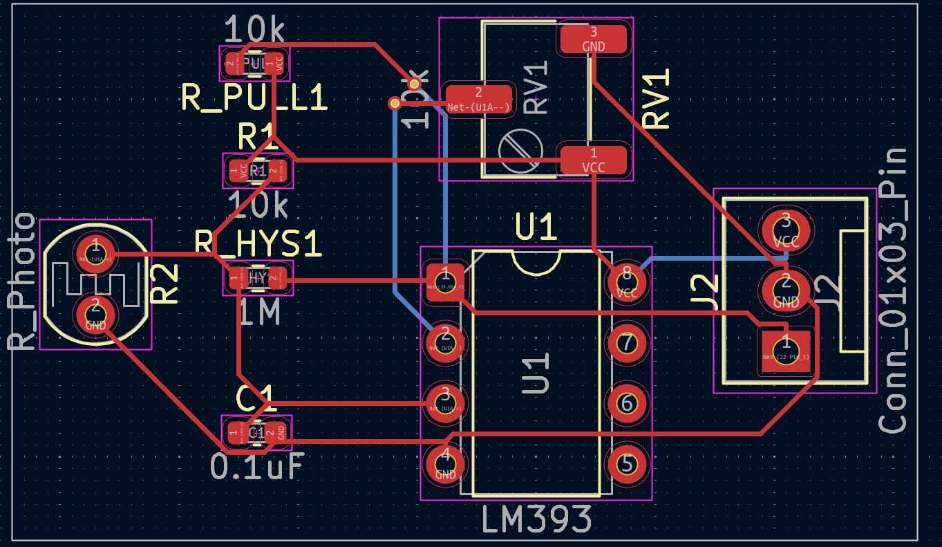 通过本次设计,我熟悉了光敏电阻在检测电路中的应用,以及利用比较器实现模拟量到数字量的转换方法。LM393 的开漏输出为模块带来更好的兼容性,既能连接 3.3V 系统,也能连接 5V 系统。PCB 设计时需要特别注意信号路径的简洁性和电源去耦,这对抗干扰能力影响较大。