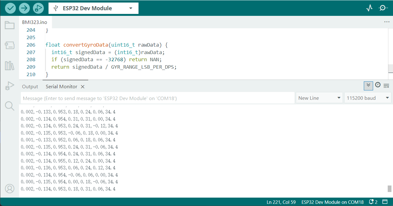 为验证六轴惯性传感器 BMI323 的正常通信与数据采集功能,我们编写了基于 Arduino 平台Wire 库的调试程序,实现了传感器的 IIC 通讯初始化、功能配置、数据采样与串口输出。关键代码如下: