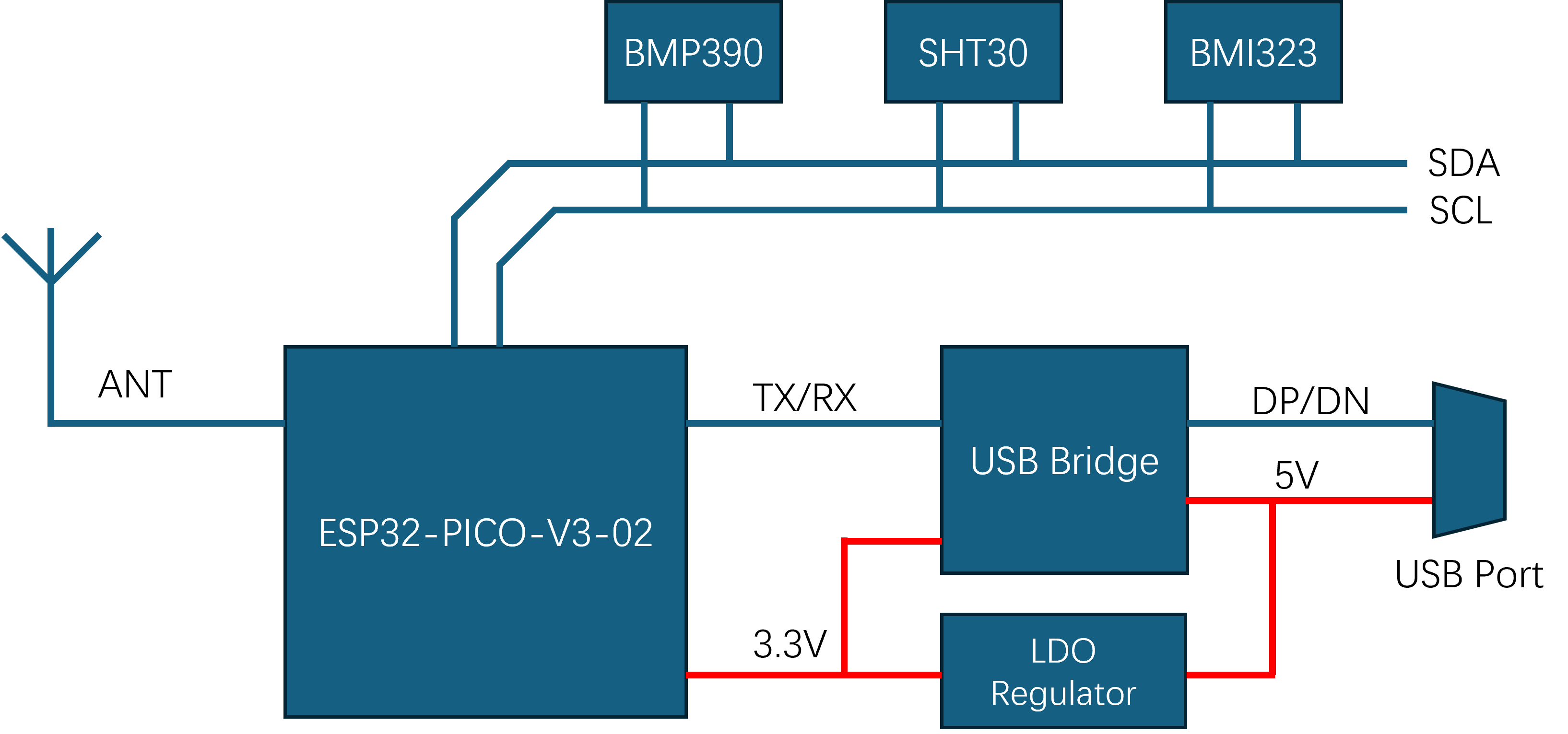 本次硬件设计在第一期ESP32-PICO-V3-02最小系统的基础上进行了功能性优化与结构精简。一方面,针对系统资源占用情况,合理裁剪未使用的I/O引脚,提升了电路布局的紧凑性;另一方面,新增一路IIC数字传感器接口,分别接入环境温湿度(SHT30)、气压高度(BMP390)与六轴惯性(BMI323)等环境传感器模块,极大丰富了系统的数据感知维度与功能拓展能力,使系统不仅具备了对周边环境变化(温度、湿度、气压)的实时监测能力,还可基于陀螺仪与加速度信息实现更灵敏的人机交互识别。