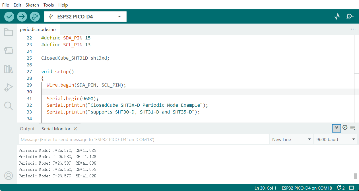 sht3xd.periodicStart(SHT3XD_REPEATABILITY_HIGH, SHT3XD_FREQUENCY_10HZ);