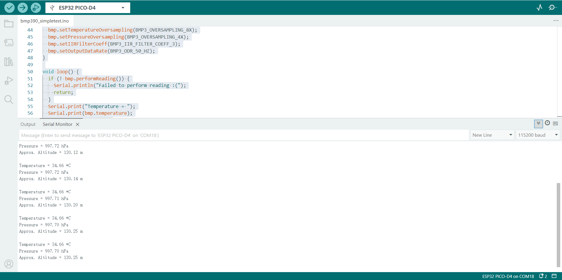 基于 Adafruit 官方 BMP3XX 库,实现对 BMP390 气压与温度传感器的初始化、配置与数据读取,并通过串口输出温度(°C)、压力(hPa)与估算高度(m)数据,从而验证BMP390设备能否正常工作。关键代码如下: