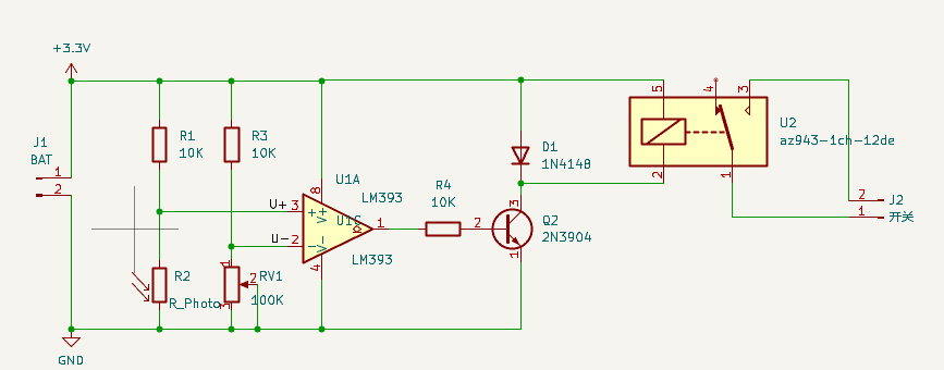 这次光控开关设计没上板子,却也有实在体会:一开始想用水滴机,算完成本和需求没必要,才定了LM393比较器;选继电器时没细看电压,画原理图才发现是5V的,跟12V供电不匹配,赶紧换了AZ943;KiCad里比较器引脚接反,ERC直接报错,改完特意标了 “光敏接2脚、电位器接3脚”;选电位器时查手册,怕单圈的调阈值不准,最后选了多圈的3386P,就怕后续调不了精细阈值。