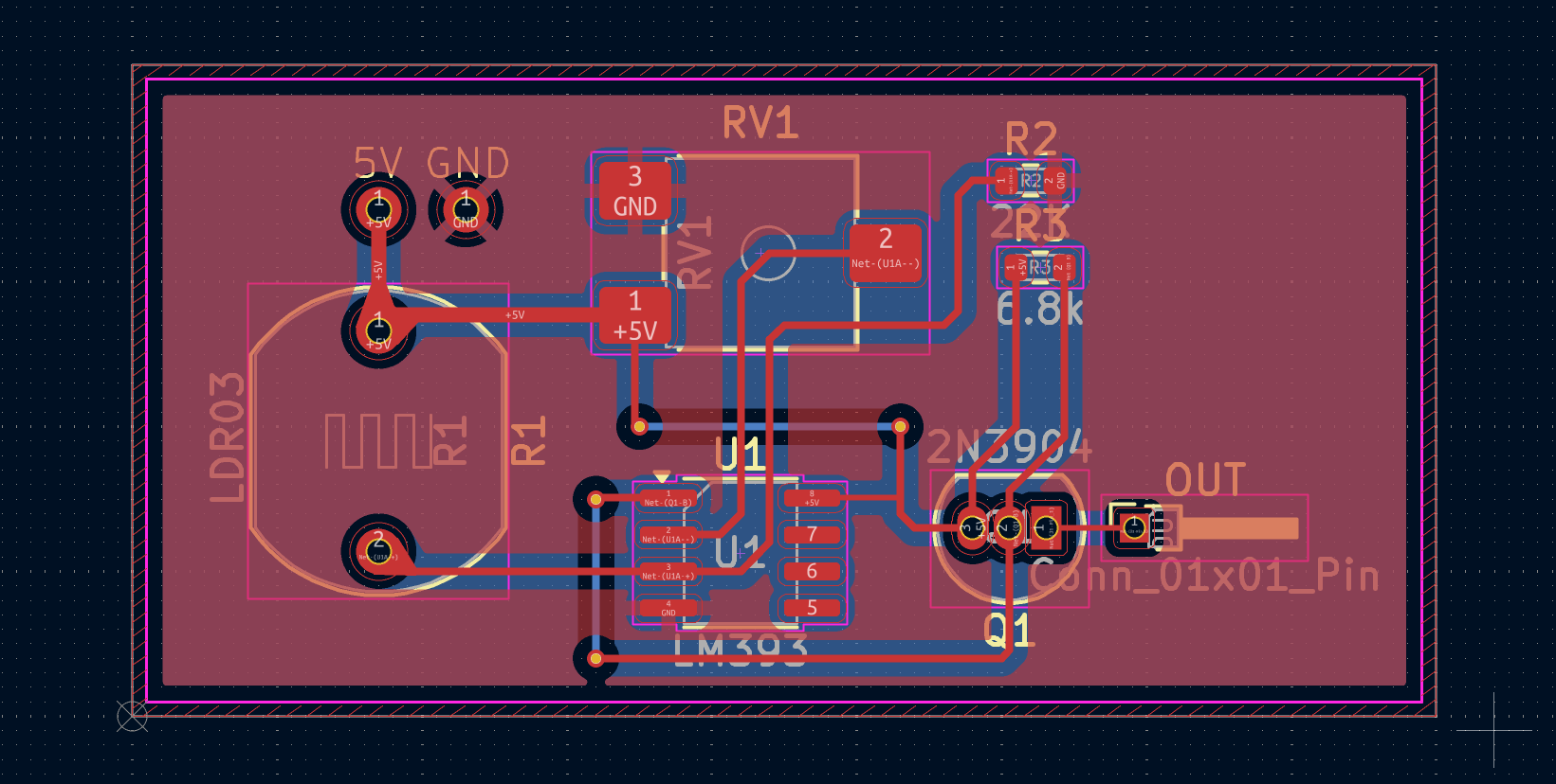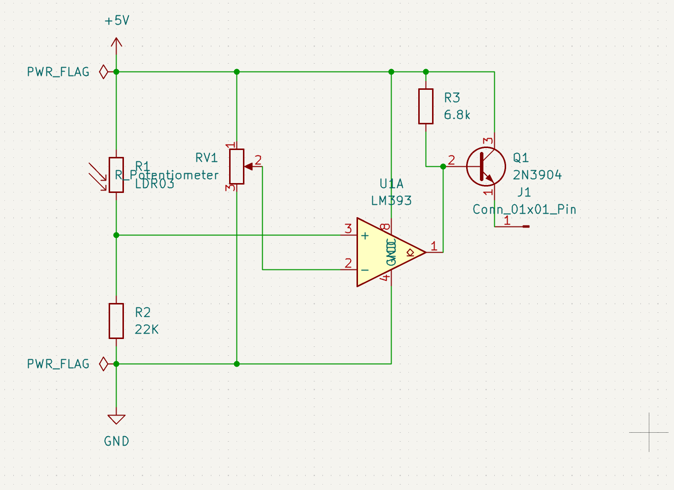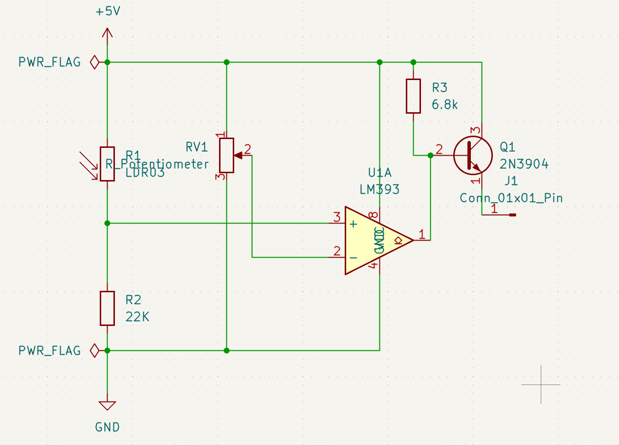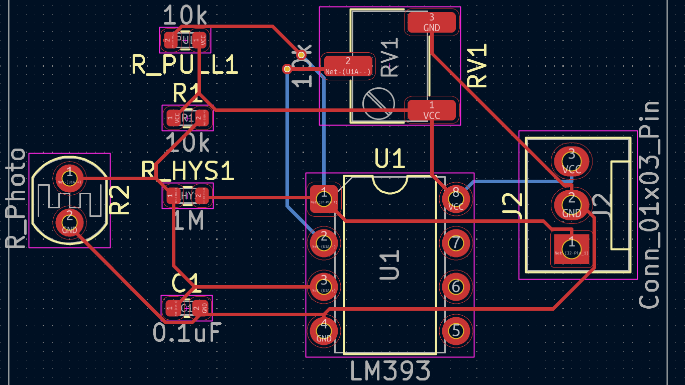 根据任务要求本次我选用的是LM393芯片设计了一个光控开关模块,这个模块的作用是输入光敏电阻后将光敏电阻电压与电位器电压进行比较,根据二者大小关系输出数字信号,阈值可以通过调节电位器来改变。lm393芯片在DigiKey官网的链接:https://www.digikey.cn/zh/products/result?s=N4IgTCBcDaIDYFsDMBOJIC6BfIA