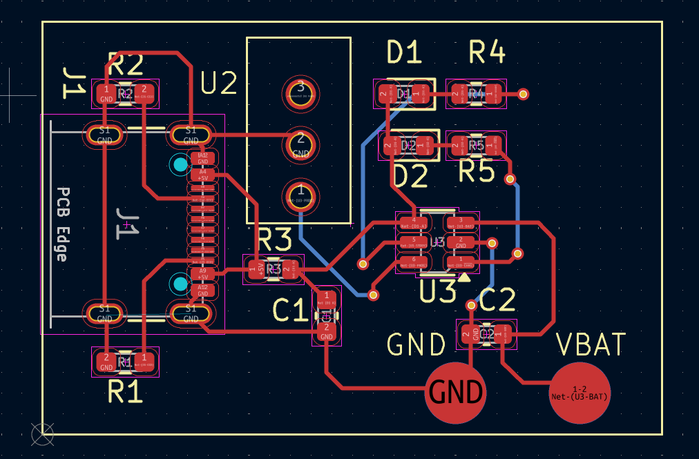 由于 TP4057 内部集成了线性恒流/恒压控制电路,板上不需要额外的开关电感元件,PCB 尺寸得以控制在 30mm × 20mm 以内,整体紧凑而清晰,适合作为学习与扩展实验的电池管理核心板。