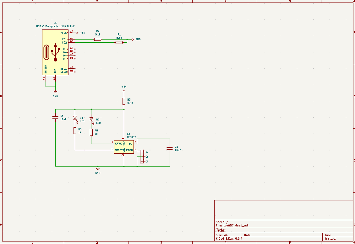 根据任务要求,本次我选用的是 TP4057 芯片 设计了一款单节锂电池充电核心板,此板卡主要用于 USB-C 接口供电的锂电池充电与管理,常用于便携式电子设备、学习开发套件中的电池供电场景,兼容直插排针接口,便于扩展板集成使用。
