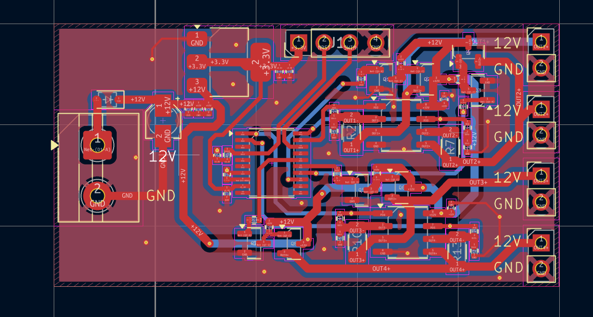 - H桥驱动:每路由一对SS8050(NPN三极管)和AO3400A(N-MOSFET)组成半桥,4组共8颗管子(Q1~Q8),可实现4路直流电机或负载的正反转控制。