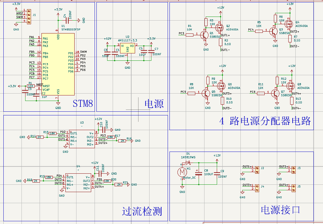 根据任务要求本次我选用的是STM8S003F3P6TR和LM358DT芯片设计了一款4路独立控制输出的电源分配器,本模块是一款基于STM8S003F3P微控制器的多通道直流电机驱动控制板,适用于小型机器人、智能小车或多通道负载控制等应用场景。其主要设计目标是实现对多路直流电机或负载的独立控制,并具备过流检测、状态反馈和编程调试等功能。