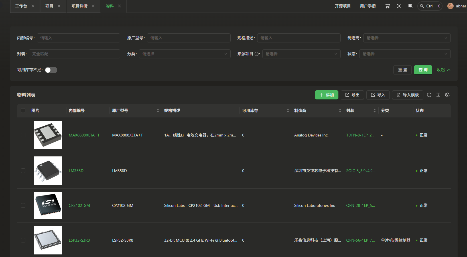 使用了eZ-PLM系统上传了自己的工程文件,方便保存记录各个版本,也可随时查阅,系统里查阅不到的物料也支持手动添加。