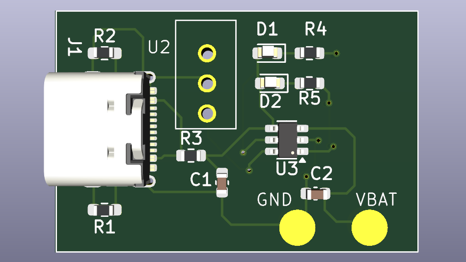 2025 Make Blocks阶段1 - USB-C锂电池充电模块设计该项目使用了TP4057 单节锂电池线性充电管理芯片,实现了基于 USB-C 接口的单节锂电池充电、充电电流可调以及充电状态指示与过充过放保护的设计,它的主要功能为:USB-C 输入充电:通过 USB-C 接口提供 5V 电源输入,支持常见适配器和电脑接口供电; 恒流/恒压充电管理:实现 100mA–1000mA 范围内可调的充电电流,并自动切换恒流与恒压模式; 充电状态指示:板上 LED 与 STAT 引脚可直观指示充电、充满等工作状态; 电池保护:集成过充、过放与短路保护电路,确保单节锂电池安全可靠运行; 模块化引脚接口:预留 VBUS、BAT、GND、STAT、PROG 等标准接口,便于扩展和集成到其它系统。