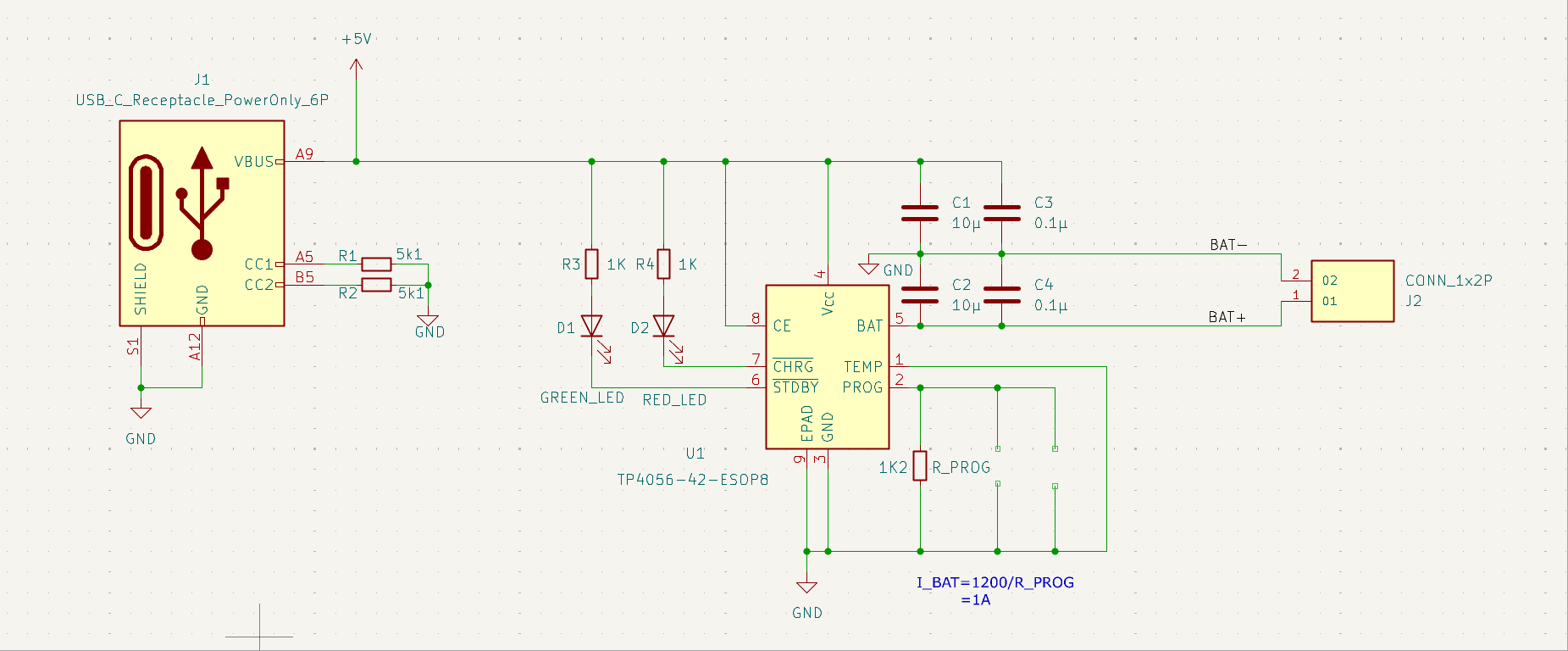 模块原理图如图1所示,供电接口采用USB Type-C母座(J1)作为电源输入,兼容现代设备,方便取电。通过5.1kΩ电阻(R1、R2)分别连接到CC1和CC2,确保Type-C接口能正确识别为下游设备,输出5V电源。充电管理以TP4056(U1)为核心,负责对锂电池进行恒流/恒压充电管理,具备过充保护、充满自动停止等功能。状态指示通过两颗LED(D1绿色、D2红色)分别指示充电状态和充满状态,配合限流电阻(R3、R4)。输入、输出端各有滤波电容(C1、C2、C3、C4),提升电源稳定性,抑制高频噪声。充电电流通过R_PROG(1.2kΩ)设定。J2为电池输出端,方便外接单节锂电池。