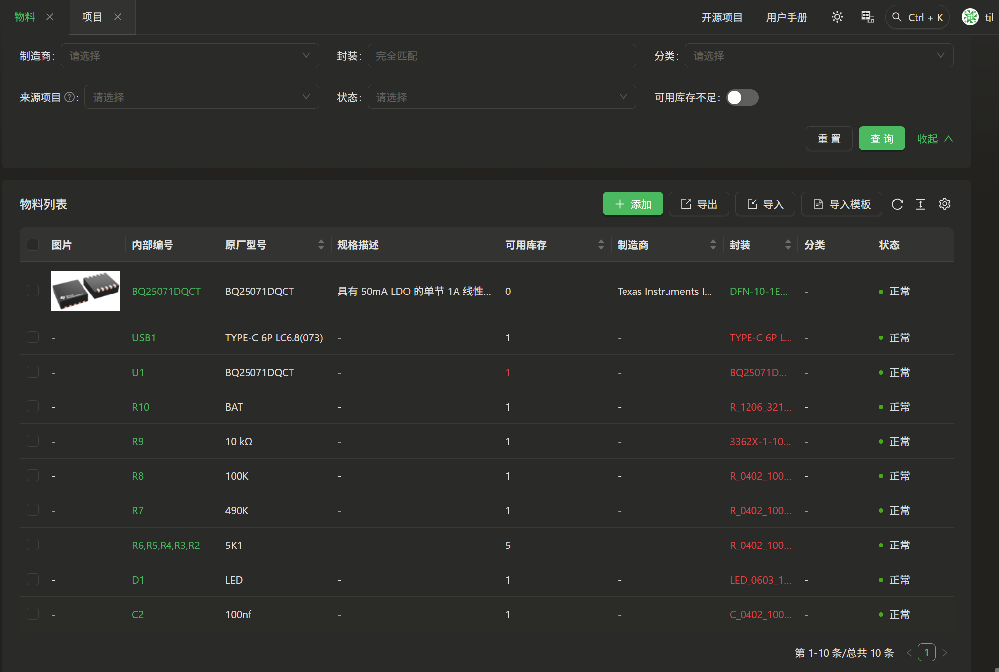 上图是eZ-PLM系统的物料管理界面。界面上方的筛选条件,可用于快速查找特定物料。下方的物料列表则展示了完成单节锂电池充电模块所需物料的详细信息,包括物料图片、内部编号、原厂型号、规格藐视、可用库存等信息。