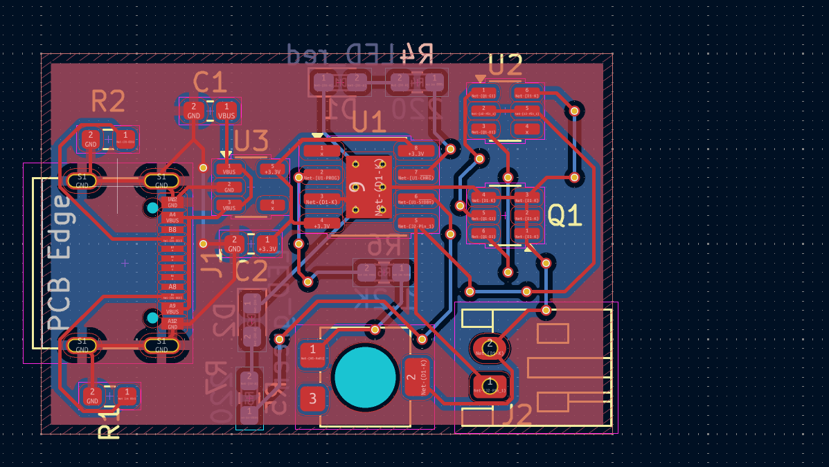 回顾整个实验过程,从最初对着电路图 “无从下手”,到最终能独立完成PCB,我掌握了锂电池充电电路的设计要点。这次实验也让我发现了自己的不足:比如对 PCB整个电路板设计时需要留出空间 —— 未来我会进一步学习 KiCad 等 PCB 设计软件,深入研究电源完整性、信号完整性相关知识,争取在后续设计中做出更稳定、更可靠的电子模块。