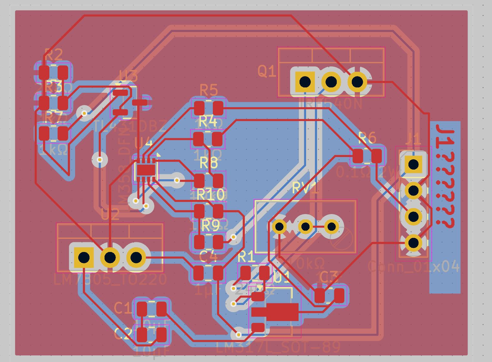 输出电流范围 | 0 ~ 5A(视MOS管散热) | 由IRF540N及R6(0.1Ω)检测,最大电流受MOS管和R6功耗限制 |