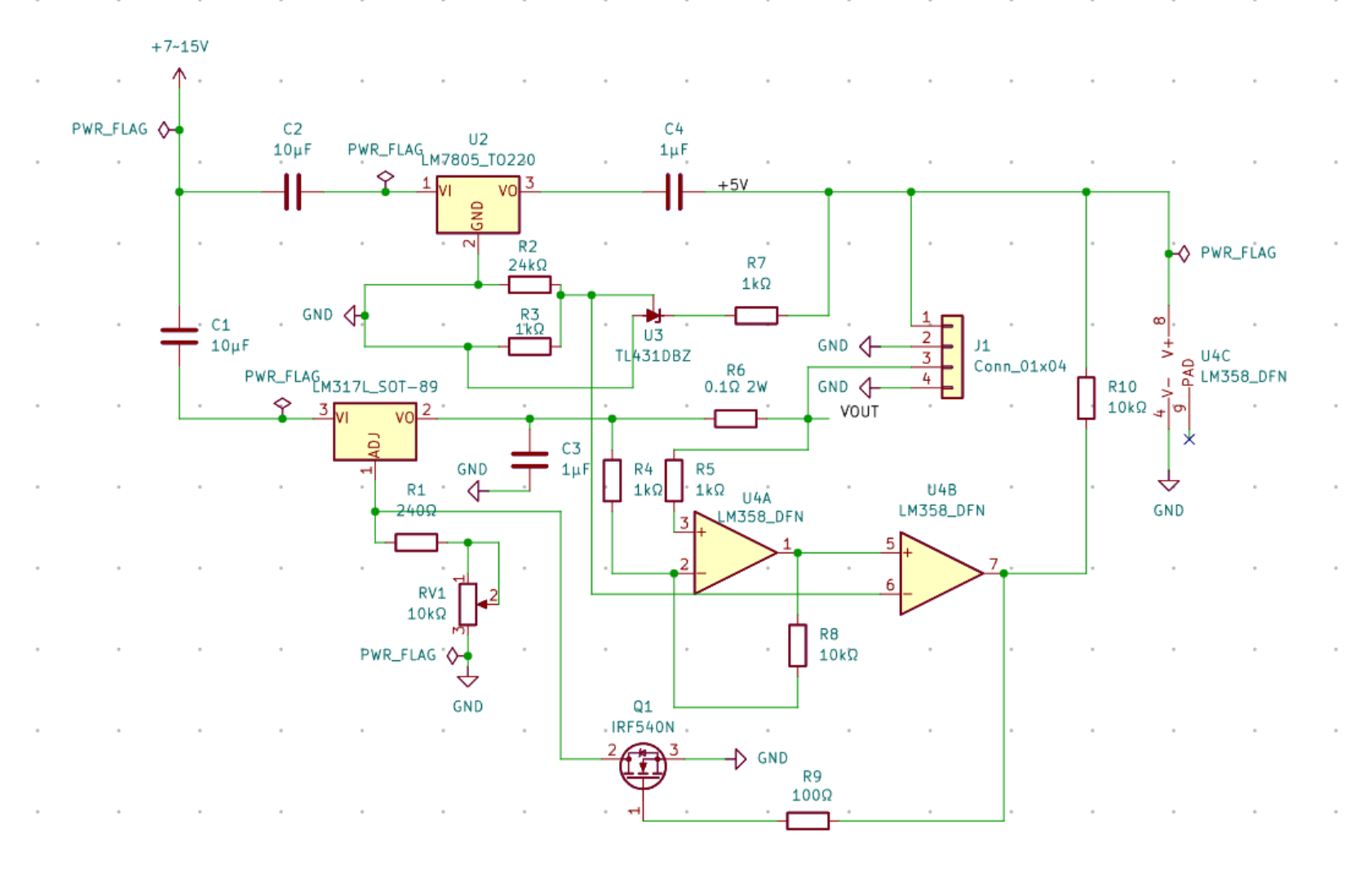 - MOSFET开关:Q1(IRF540N)作为主功率开关,受控于运放输出,实现对负载的电流/电压调节或保护。