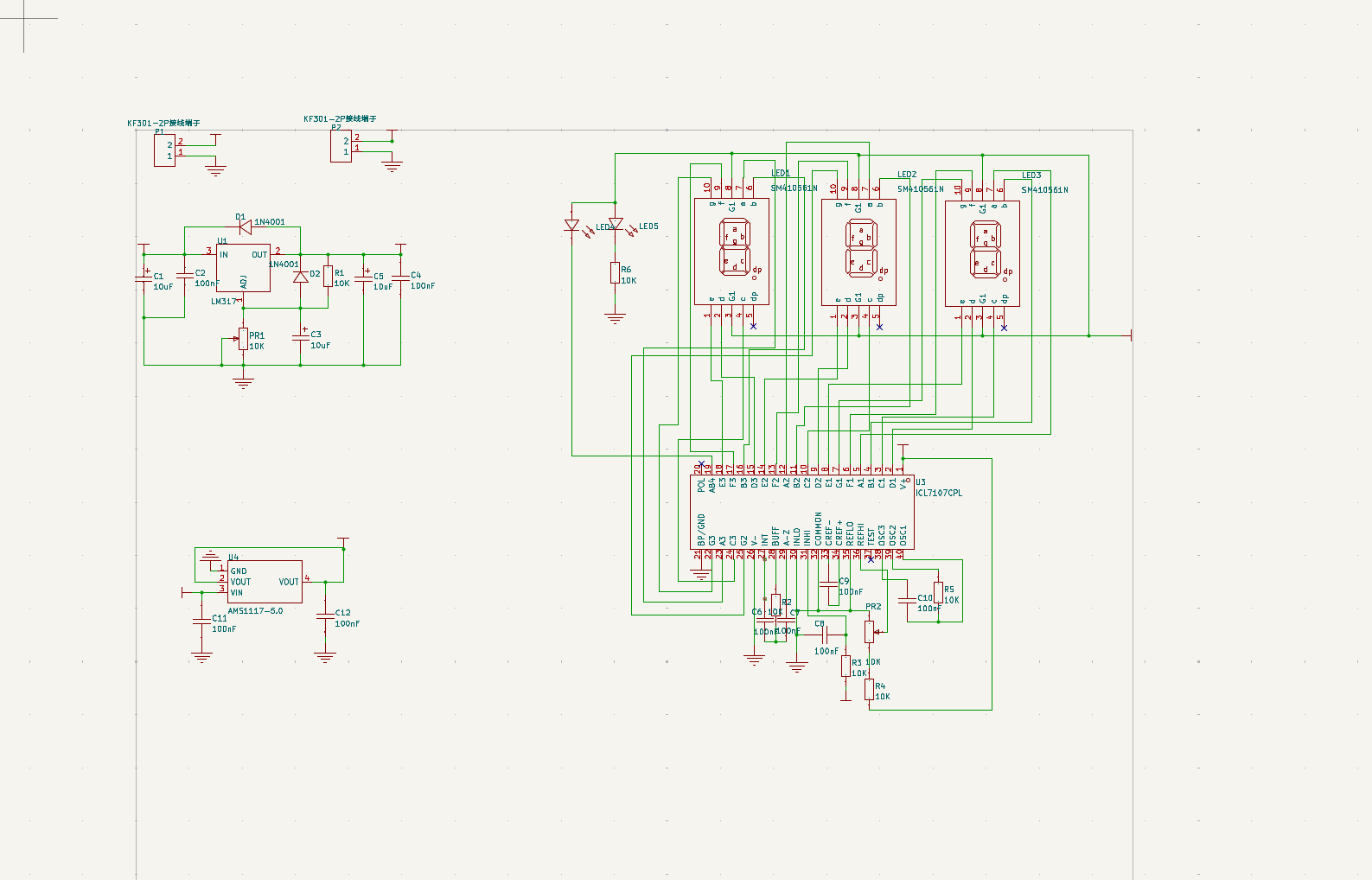 - AMS1117 - 5.0:产生稳定的 5V 基准电压,为电压采样电路和 ICL7107 提供准确的参考,确保输出电压测量的精度,保障数字显示的准确性,在精密电源监测和显示系统中起到关键的基准作用。