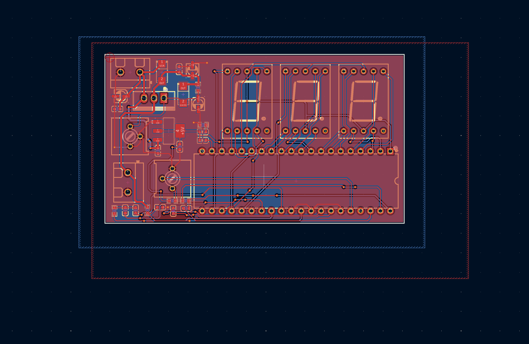 PCB 设计将基于原理图,合理布局各个元器件,确保信号的稳定传输。考虑到 PCB 尺寸限制在 45mm×35mm,会对元器件进行紧凑但不影响散热和电气性能的排列。电源输入和输出部分的走线要保证足够的宽度,以承受最大 1A 的电流。数字显示部分的走线要尽量短,减少干扰,保证显示的准确性。同时,要设置合适的过孔和铜箔,增强电路的电气连接和散热能力。