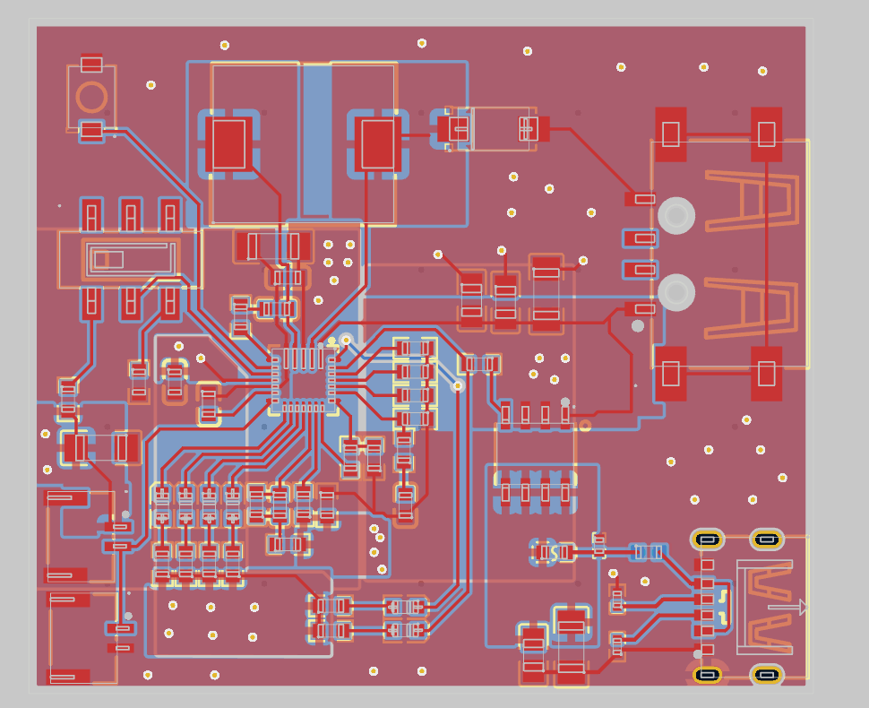 根据任务要求本次我选用的是MP2639C芯片,此板卡主要用于双节电池充电,板载USBC接口可以直接连接适配器,两个GH1.25插座用于连接锂电池,1个USBA接口实现电池对外放电,充放电由板载拨动开关控制,同时放电时,可以使用板载按键开关实现关闭