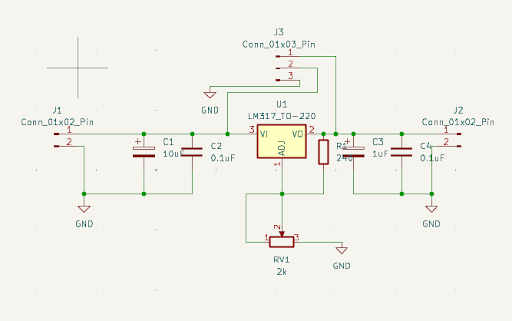 在本设计中,R1选用240Ω的固定电阻,RV1为2kΩ的可调电位器。通过旋转RV1,即可轻松改变输出电压。 - 输出部分: 稳压后的电流从LM317的VOUT引脚输出,经过C3 (1uF) 和 C4 (0.1uF) 再次滤波后,由J2输出。输出侧的电容有助于改善负载的瞬态响应,并进一步抑制噪声。