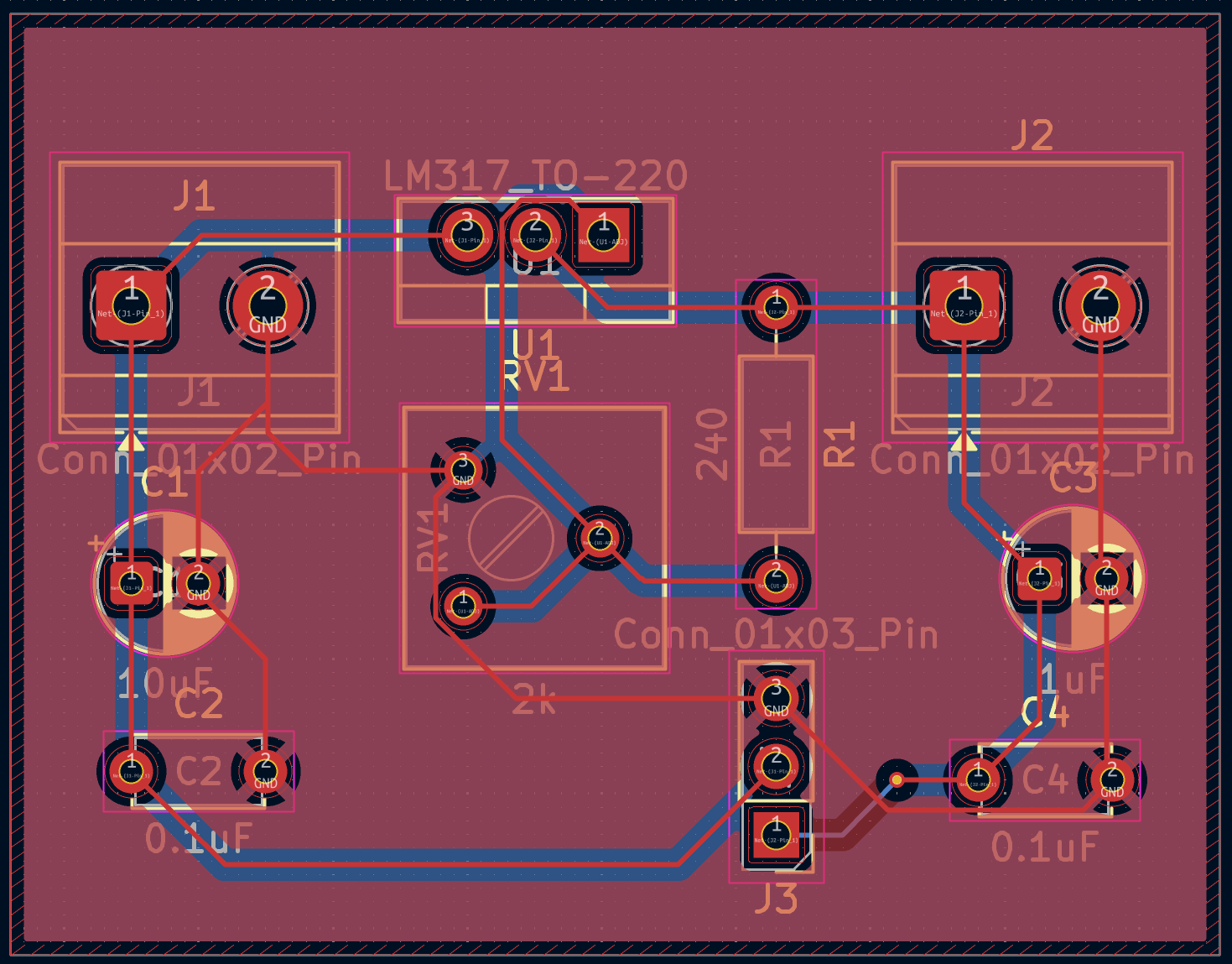 - 人机交互友好: 将可调电位器 RV1 和三个接线端子 J1, J2, J3 放置在电路板的边缘,方便用户接线和调节电压。