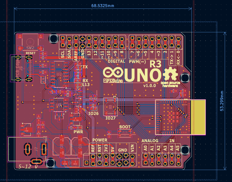 - PCB尺寸:完全匹配 Arduino Uno R3(68.6mm × 53.3mm),支持现有扩展板和外壳。