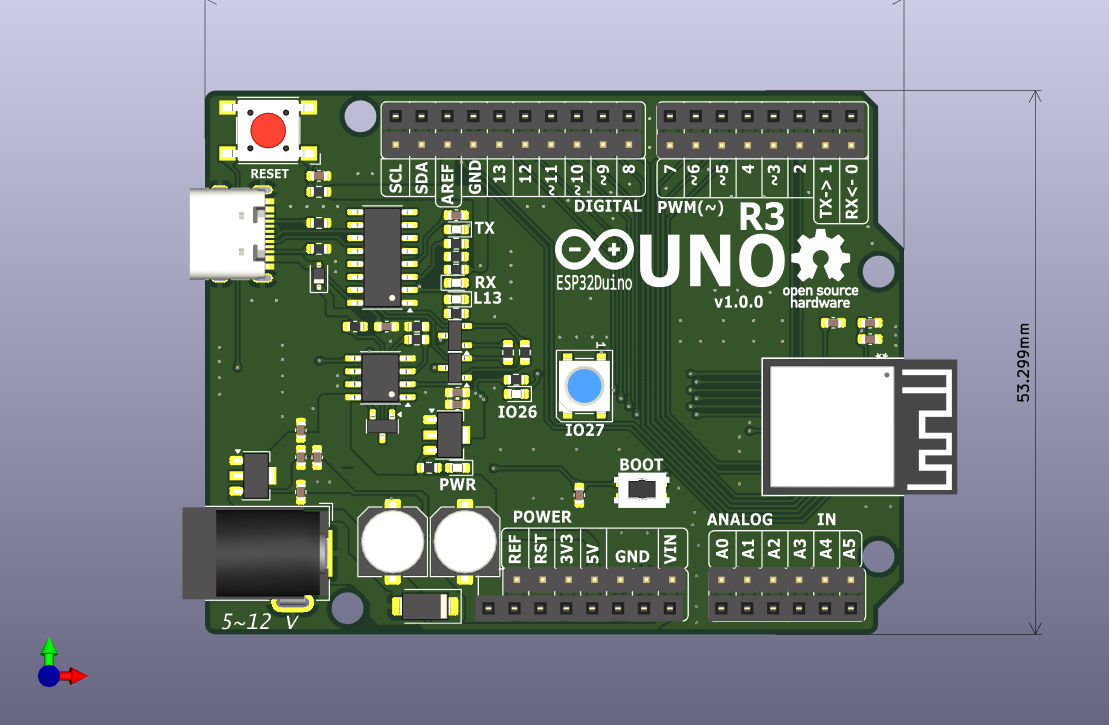 本项目旨在设计并开发一款名为 ESP32Duino 的开发板。该板卡的核心特点是完全兼容经典的 Arduino Uno R3 的物理接口与引脚布局,同时以功能更强大的 ESP32-MINI-1 WiFi 模块作为主控制器。ESP32Duino 无缝桥接了易于上手的 Arduino 生态系统与强大的物联网能力,让开发者能够在不改变原有 Uno 项目硬件结构的情况下,轻松为其添加 Wi-Fi、蓝牙等无线连接功能,极大地简化了从传统单片机项目向物联网应用的升级路径。