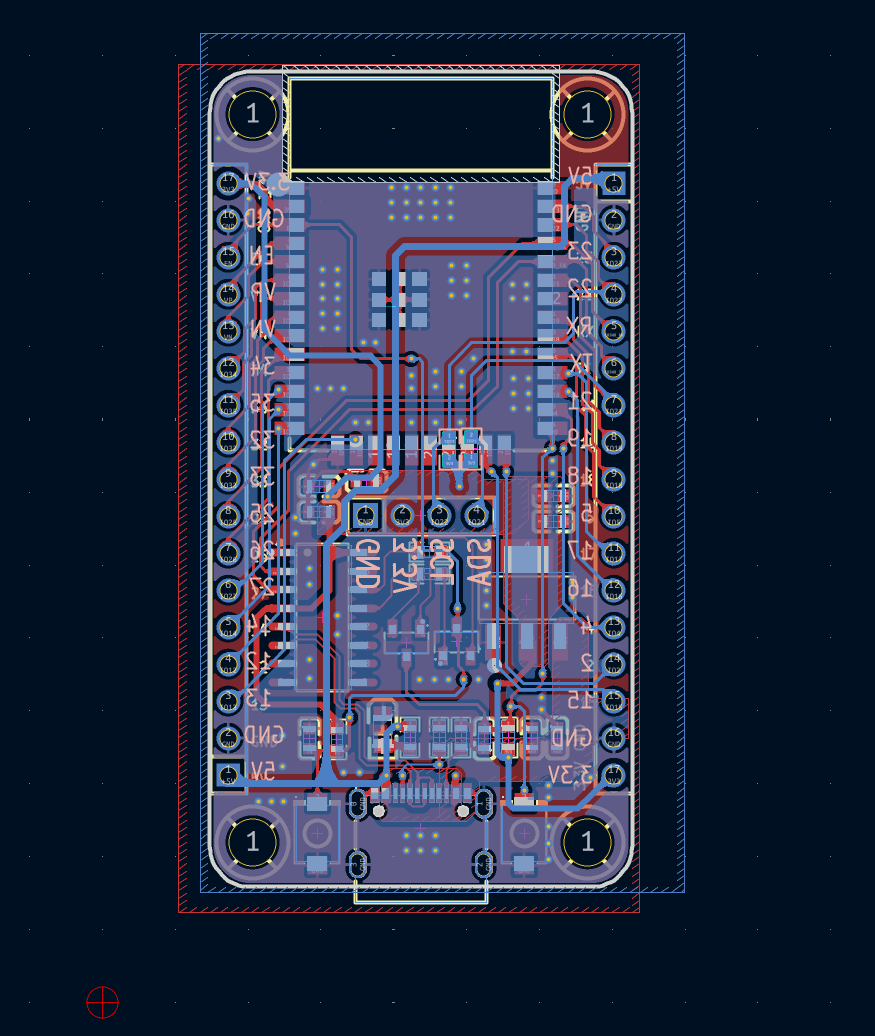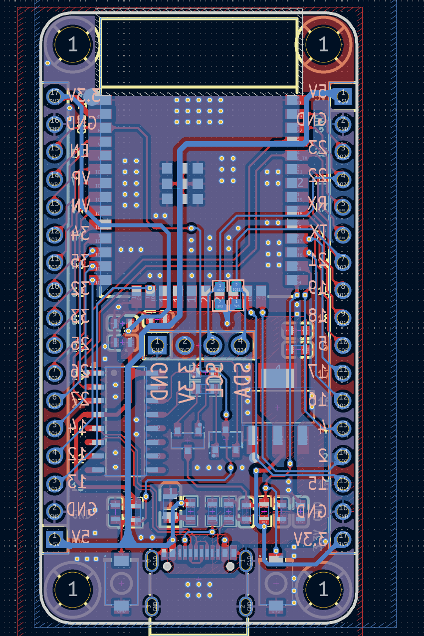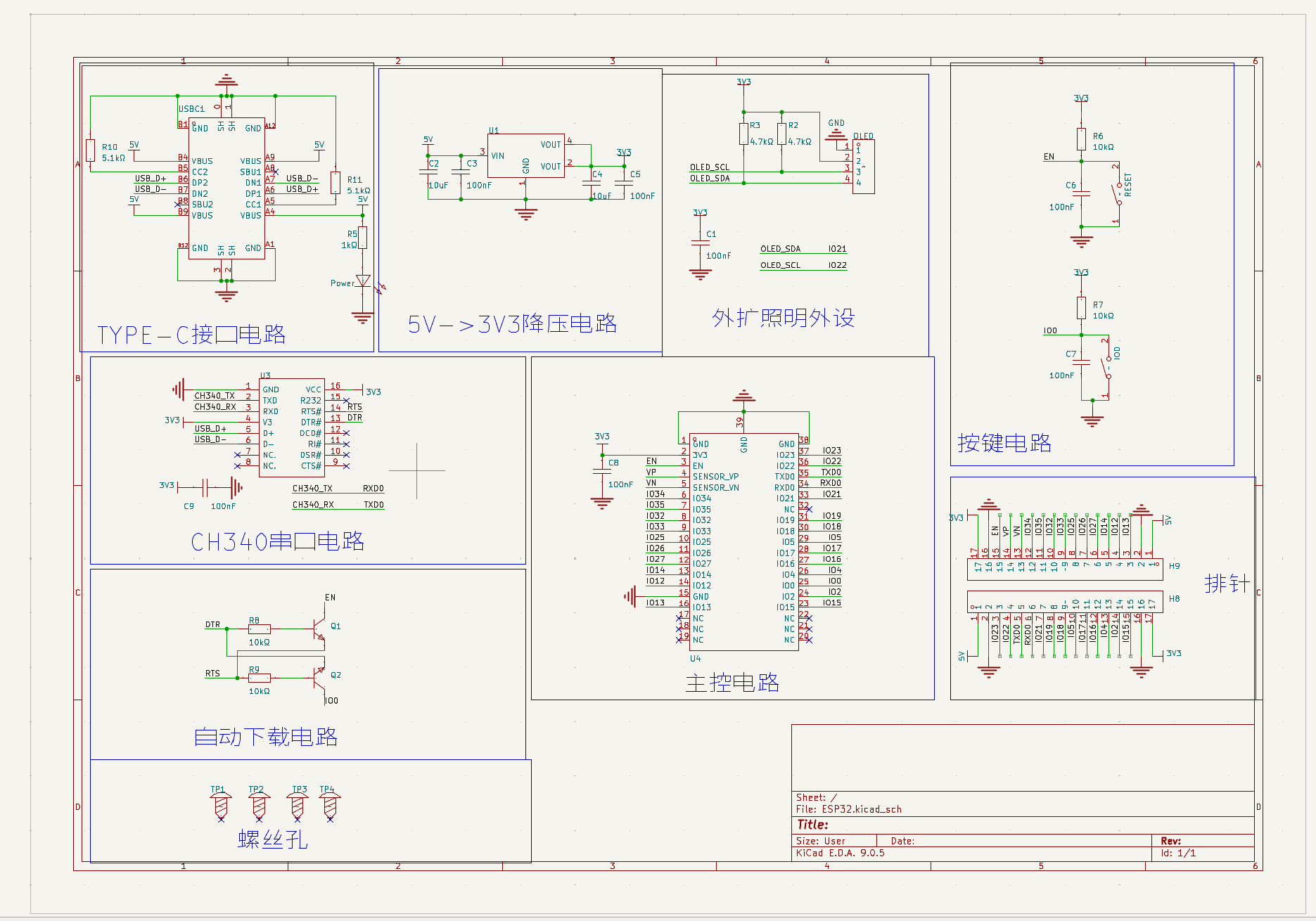 本项目以ESP32芯片为核心,使用KiCad电子设计自动化软件完成了原理图绘制与PCB设计,实现了一款集电源管理、通信接口、自动下载及外设扩展于一体的多功能物联网控制板。系统采用Type-C接口作为主要电源输入端,通过LDO稳压模块将5V电压转换为3.3V稳定电源,为主控芯片及其他功能模块供电。主控部分选用ESP32-WROOM-32模块,具备双核处理能力与Wi-Fi、蓝牙通信功能,适用于多种物联网应用场景。电路中集成了CH340串口通信芯片,实现USB转UART数据通信,便于程序烧录与调试。配合RTS和DTR信号的自动下载电路,可在无需手动按键的情况下完成程序上传。此外,电路设计中还包含RESET复位按键、I²C扩展接口以及外接排针,方便连接OLED显示屏及其他传感器模块,实现系统的功能扩展。