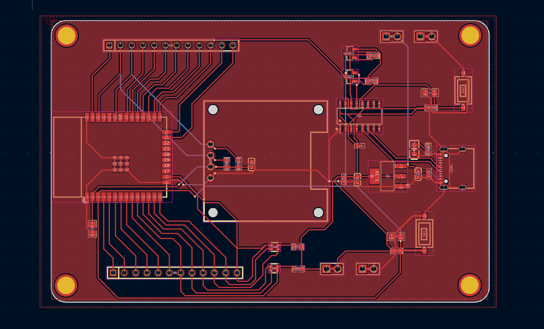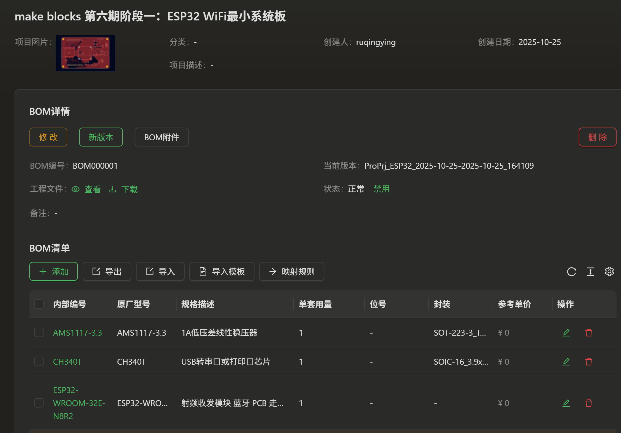 其次,核心元件的选型与功能理解让我对系统的 “大脑” 有了更具象的认知。ESP32-WROOM-32E-N8 作为主控芯片,集成了 Wi-Fi 与蓝牙功能,还具备丰富的 GPIO 引脚用于外设扩展。从原理图中可以看到它与各个模块的连接:与 CH340 串口电路配合实现程序下载与串口通信,与 OLED 显示电路(HS6623W2C03 驱动)实现信息可视化,与按键电路实现人机交互,与无线排针电路预留传感器或执行器的扩展接口。这让我明白,主控芯片的选型必须充分考虑系统的功能需求,其外设资源的丰富程度直接决定了系统的可扩展性。同时,像 CH340 串口芯片、AMS1117 电源芯片、各种阻容元件的选型,也都要兼顾性能、成本与可采购性,这让我意识到嵌入式开发是一个需要在技术与工程现实之间寻找平衡的过程。
