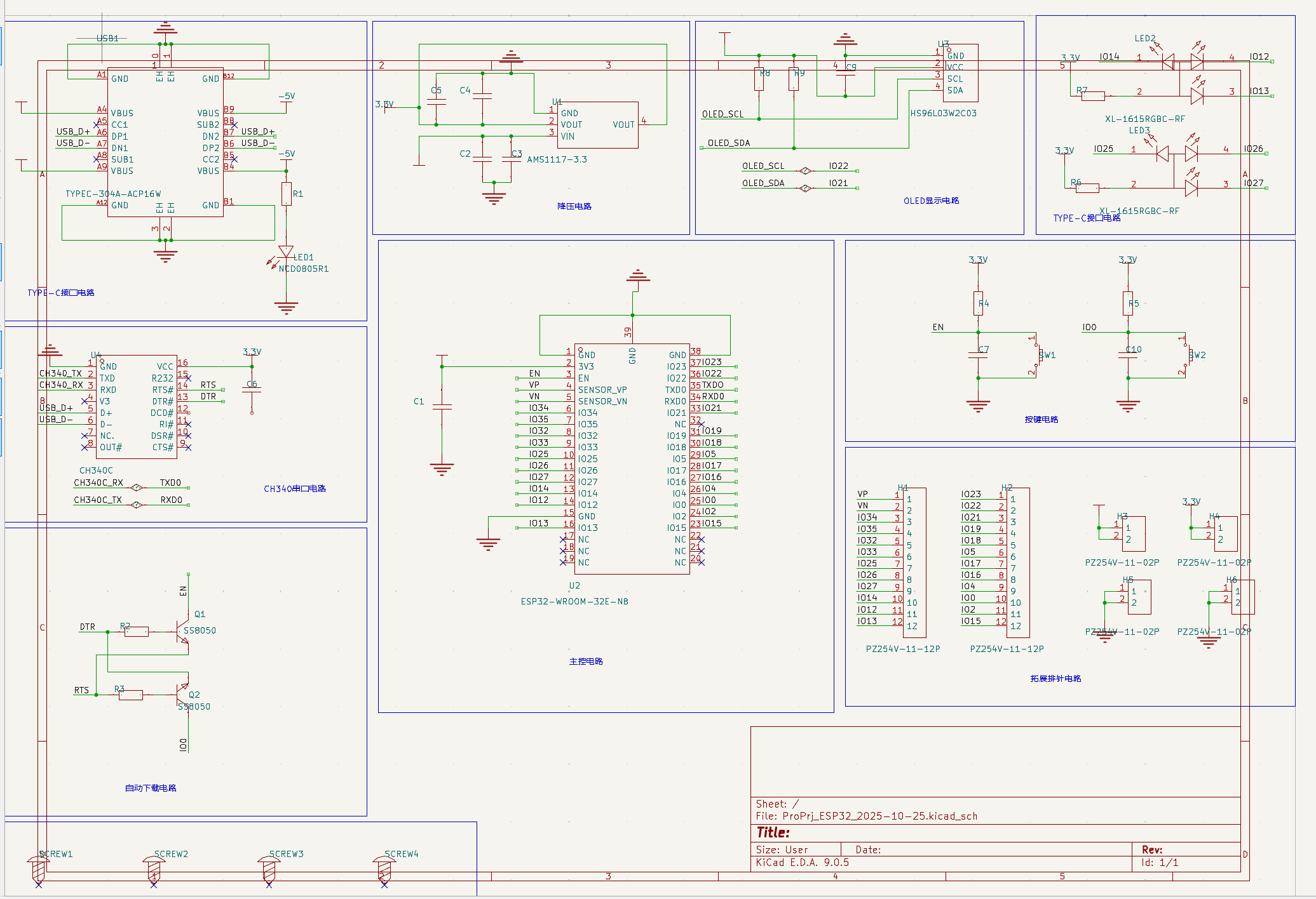 首先,模块化设计的思维在这份原理图中体现得淋漓尽致。整个系统被清晰地划分为 TYPE-C 接口电路、降压电路、OLED 显示电路、TYPE-C 指示灯电路、CH340 串口电路、主控电路、按键电路、无线排针电路、自动下载电路等多个功能模块。这种模块化的设计不仅让电路的逻辑结构一目了然,更便于后期的调试、维护与功能扩展。比如 TYPE-C 接口电路既承担了电源输入的任务,又实现了数据通信功能,为系统与外部设备的连接搭建了桥梁;降压电路采用 AMS1117-3.3 芯片,将输入电压稳定转换为 3.3V,为 ESP32 主控芯片及其他外设提供可靠的电源,这让我意识到电源管理在嵌入式系统中的核心地位 —— 稳定的电源是系统稳定运行的基石,不同模块对电压的需求差异也要求我们在电源设计上做足功课。