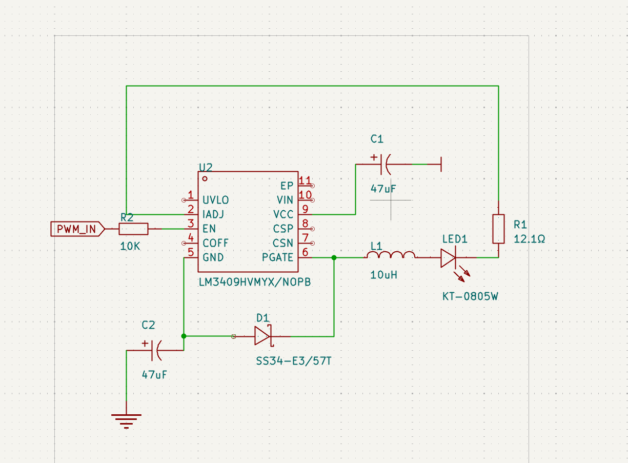 本次任务为设计一款基于 LM3409HVMYX/NOPB 芯片的单路 PWM 调光 LED 恒流驱动模块,核心功能是将宽范围直流输入电压(如 12V 车载电源、5V USB 电源、24V 工业电源等)转换为稳定的恒流输出,同时支持 0-100% 占空比的 PWM 调光控制,满足不同场景下 LED 照明设备的供电与亮度调节需求。