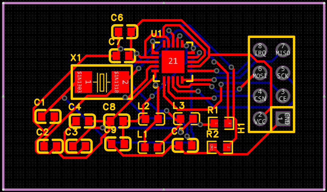 - 外部接口 (H1): 8引脚连接器,引出SPI总线(SCK, MOSI, MISO, CSN)、控制信号(CE, IRQ)及电源(VCC)。