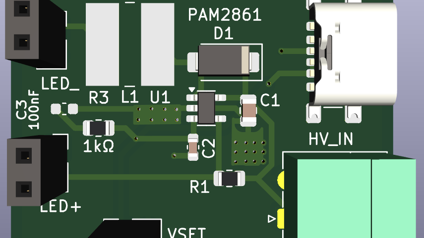 2025 Make Blocks第六期阶段1-任务5 单路PWM调光LED恒流驱动该项目使用了KiCad软件,实现了PAM2861的单路PWM调光LED恒流驱动的设计,它的主要功能为:适配6-40V宽输入电压,输出1A恒流,支持PWM与模拟双调光模式驱动LED。