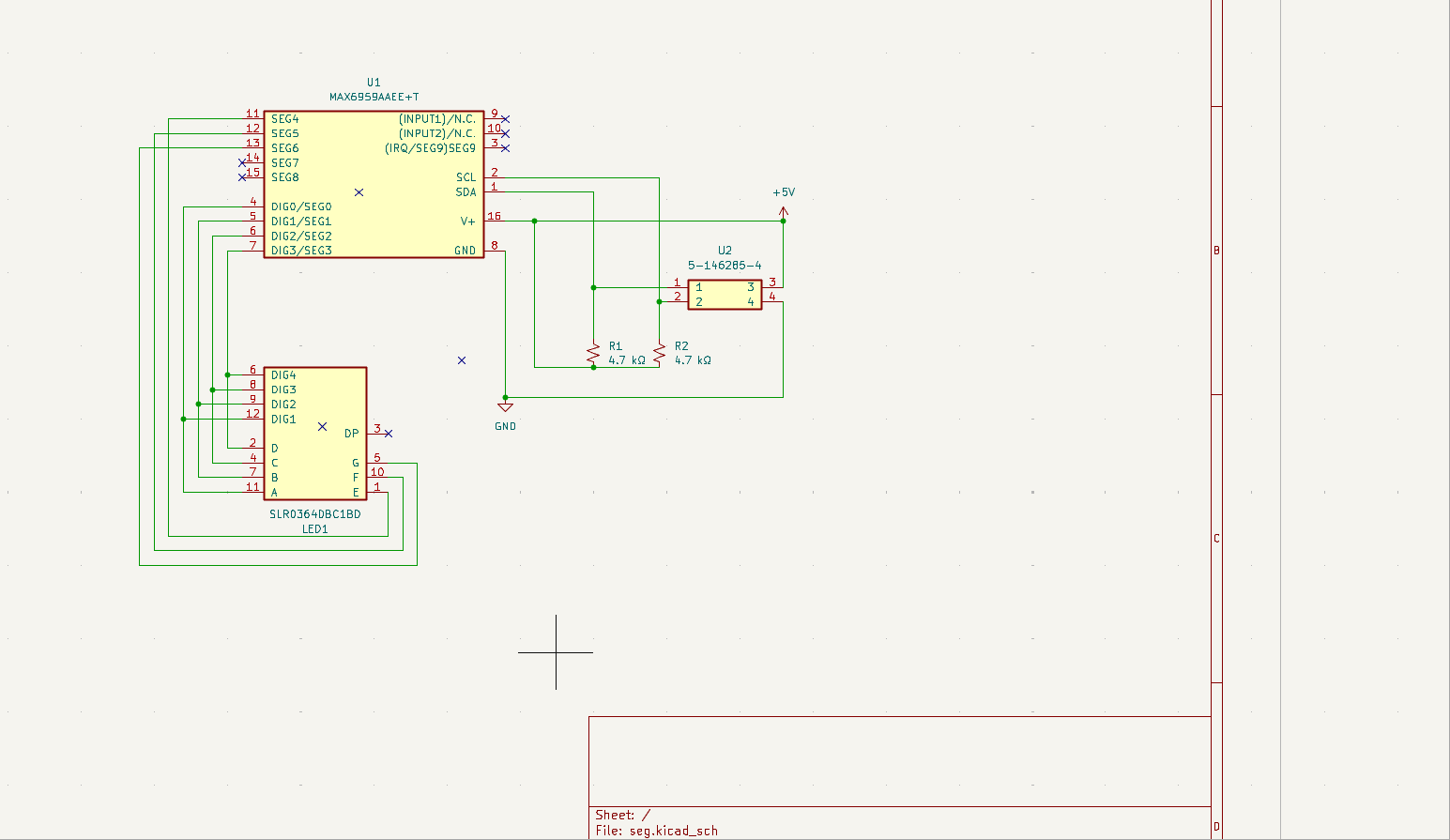 该原理图展示了一个基于 **MAX6955AAEE+T(U1)的数码管显示电路。核心元件 U1 是一款显示驱动芯片,采用 + 5V 电源供电,其 V+(16 脚)接 + 5V,GND(7、8 脚)接地构成电源回路。芯片的 SDA(1 脚)和 SCL(2 脚)为 I2C 通信引脚,通过上拉电阻 R1、R2(均为 4.7kΩ)连接至 + 5V,以保障 I2C 总线的通信稳定性。U1 的 SEG(段)和 DIG(位)引脚与数码管SIRO3640BC1BD(LED1)** 的对应引脚相连,用于驱动数码管显示。此外,电路中还存在 U2(5-146285-4)元件,部分引脚未做连接。整体电路通过 I2C 总线实现对数码管的显示控制,完成数字或字符的显示功能。