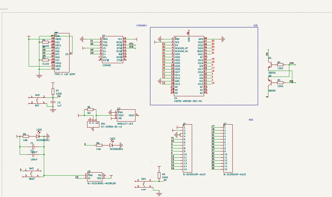 根据任务要求本次我选用的是ESP32-S3-WROOM-1-N4 这款模组已经包括所需的天线和外围电路我们只要进行搭建供电和烧录电路即可