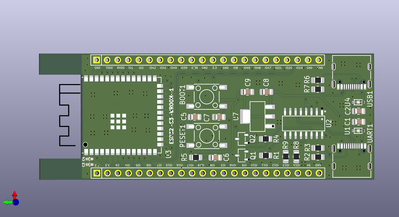该快核心板使用的ESP32-S3-WROOM-1-N16R8模组,该模组含有板载天线,所以对板载天线部分进行挖槽处理,防止信号干扰,且使用的是N16R8型号,内部集成了Octal SPI PSRAM,IO35,IO36,IO37不可用于其他连接,因此设计时这三个引脚没有引出。整体基本使用0805封装,更加方便手工焊接