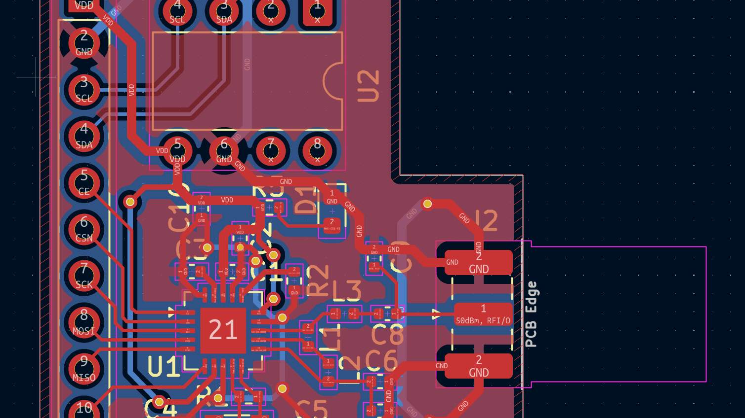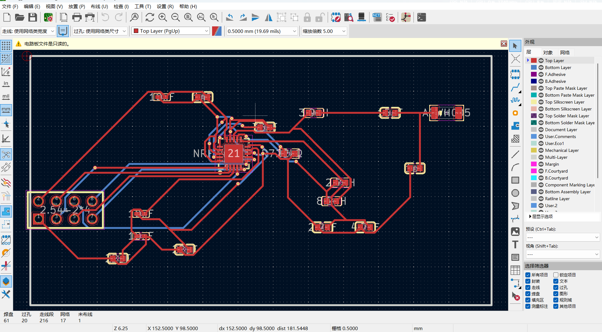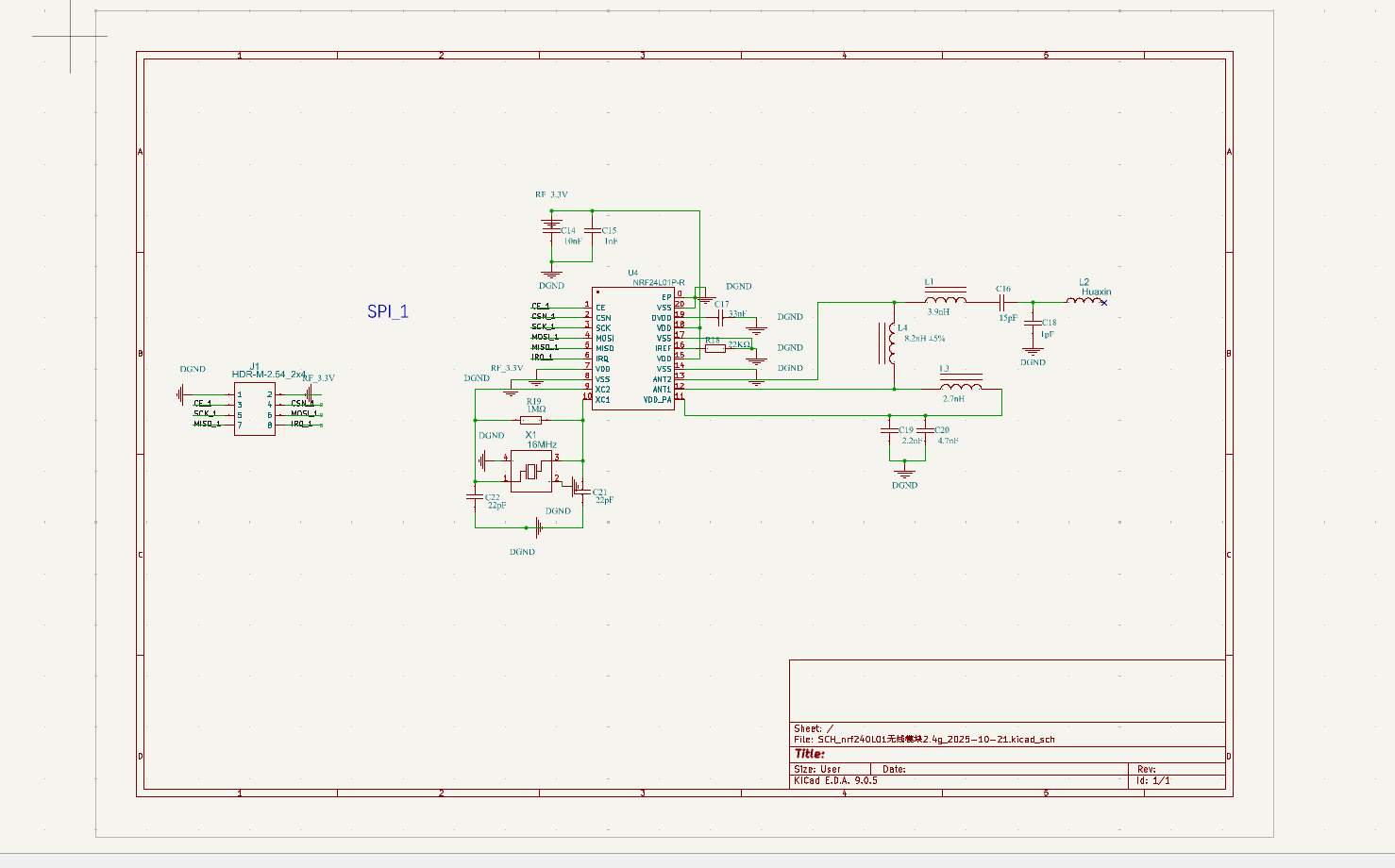 - 核心芯片NRF24L01R居中布局,射频电路(天线、匹配网络)靠近芯片,缩短高频信号路径,减少干扰。