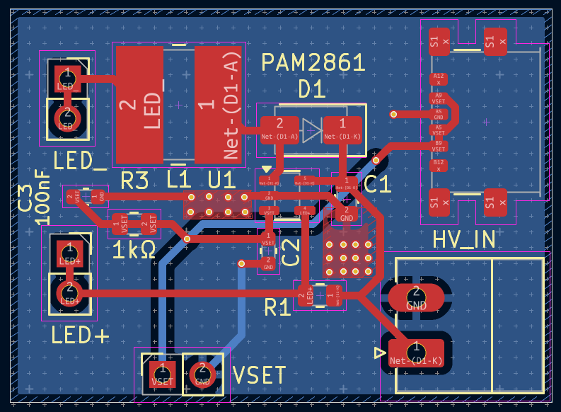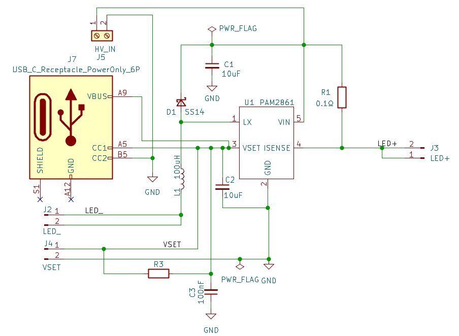 本项目核心为基于PAM2861的单路LED恒流驱动模块,适配6-40V宽输入电压,输出1A恒流,支持PWM与模拟双调光模式驱动LED。输入电源通过USBC接口或HV_IN接口输入,驱动LED负载,通过VSET接口实现亮度或开关控制。