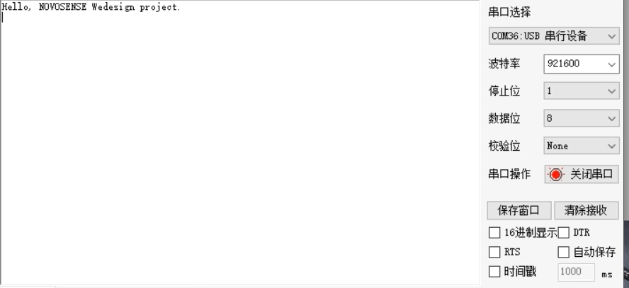 串口输出: 在串口助手窗口中,能看到字符串 "Hello, NOVOSENSE Wedesign project." 被打印出来。